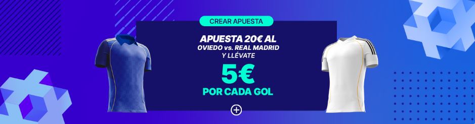 Este fin de semana se disputa la jornada 2 de LaLiga, donde Oviedo y Real Madrid buscan los tres puntos. Aprovechando este gran evento y que desde hace unos meses ofrecen la opción de Crear Apuesta, han organizado la siguiente promoción donde podrás llevarte 5€ en Freebets por cada gol que haya en el partido de este domingo.