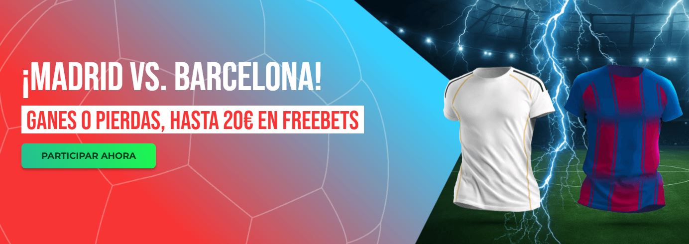 A continuación, realiza una apuesta mínima de 20€ al partido Real Madrid vs Barcelona, con cuota igual o superior a 2.0, ya sea simple o usando la función «Crea tu Apuesta».