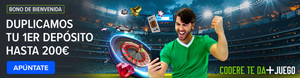 Si todavía no eres cliente de Codere y prefieres registrarte con un bono de bienvenida en lugar de con la promoción de 5€ por gol para el Atlético vs Madrid, te recomendamos que solicites la promoción para nuevos usuarios. Con esta bonificación, podrás conseguir 100€ en Apuestas y 100€ en Casino con tu primer ingreso. Te contamos todos los detalles de la oferta en nuestra Guía sobre el Bono Codere.