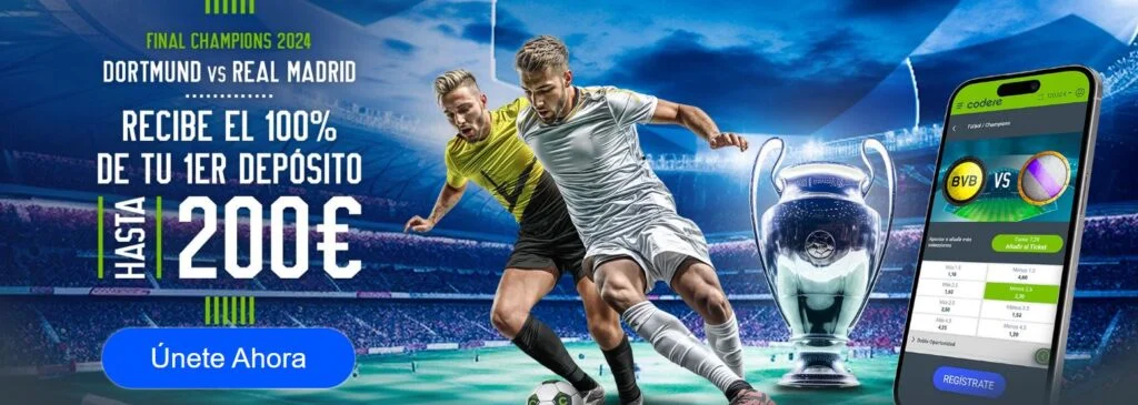 - Codere: Real Marid es campeón: 1.30 | Borussia Dortmund es campeón: 3.20