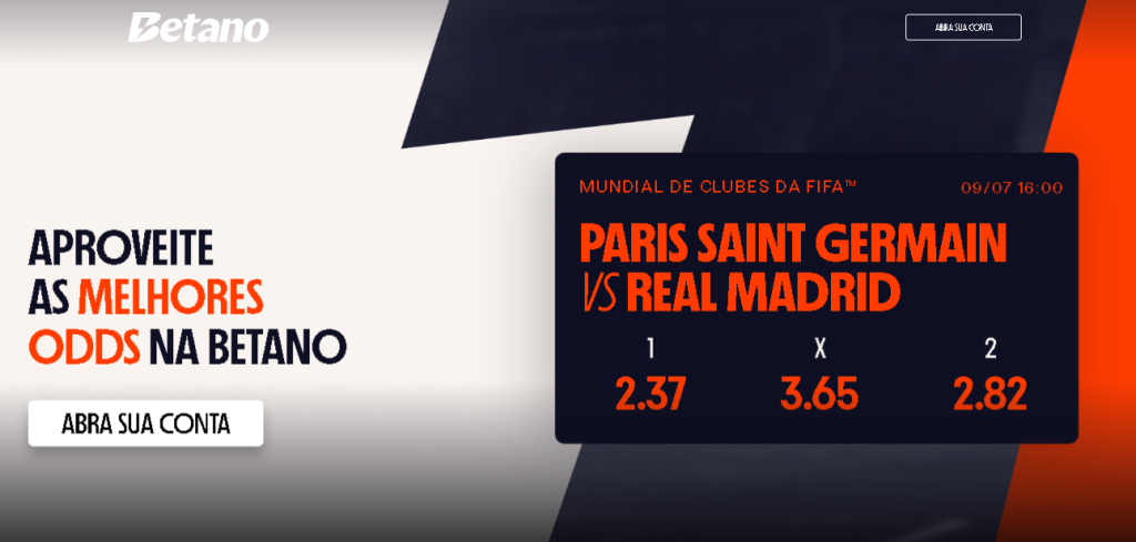 A partida entre PSG e Real Madrid será disputada na quarta-feira, dia 9 de julho, às 15:00 horas, no Brasil. As chances oferecidas pelo Betano são as seguintes: