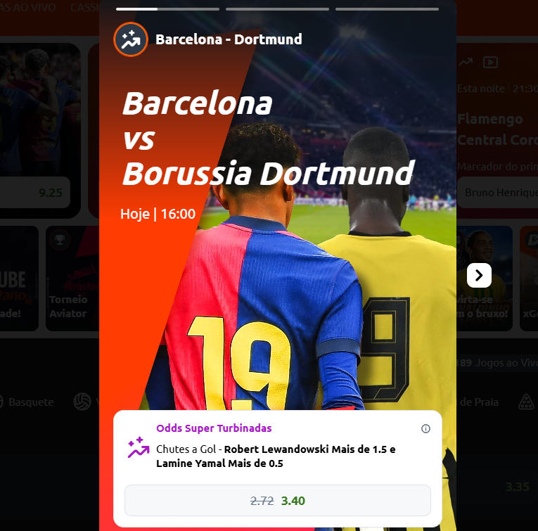 O Barcelona enfrenta o Borussia e no Betano você pode apostar com Odds Super Turbinadas. Uma partida imperdível e espetacular, pela Liga dos Campeões. Aposte alto no Betano Brasil!