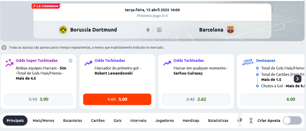 Como já anunciamos, para viver a grande jogo da Liga dos Campeões, o Betano oferece Odds Super Turbinadas com seleções exclusivas aumentadas para ganhos ainda maiores em Dortmund x Barcelona. Você gostaria de conhecer alguns deles?