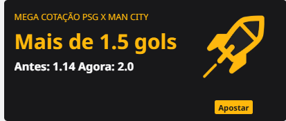 Como já anunciamos, para viver a grande jogo da Liga dos Campeões, o Betano oferece Super Odds Turbinadas com seleções exclusivas aumentadas para ganhos ainda maiores em PSG x Manchester City. Você gostaria de conhecer alguns deles?