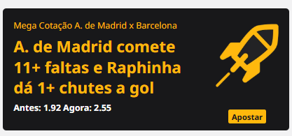 | Mega cotação | 2,55 se A. de Madrid comete 11+ faltas e Raphinha dá 1+ chutes a gol |