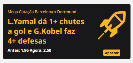 Aproveite a Mega Cotação da Betfair para Barcelona x Borussia com probabilidades de 2,50 se L.Yamal dá 1+ chutes a gol e G.Kobel faz 4+ defesas. Aposte até R$ 20,00 na jogo, comemore alto e ganhe um aumento de odds de 1.96 para 2.50!