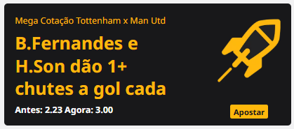Aproveite a Mega Cotação da Betfair para Tottenham x Manchester United com probabilidades de 3,00 se se B.Fernandes e H.Son dão 1+ chutes a gol cada. Aposte até R$ 15,00 na jogo, comemore alto e ganhe um aumento de odds de 2.24 para 3.00!