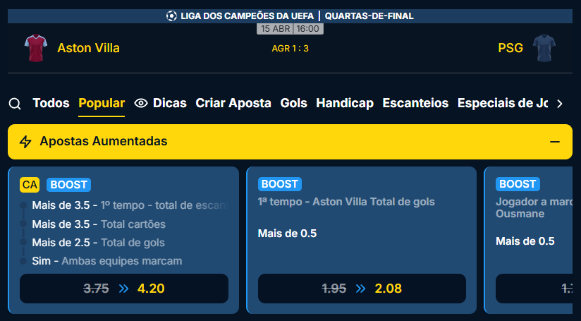 Por sorte para você, a EstrelaBet propõe Boost para melhorar os ganhos nos bilhetes dos clientes que se atreverem a apostar no Aston Villa x PSG. Uma vantagem interessante para ganhar muito mais com seu esporte favorito. Junte-se ao EstrelaBet e faça suas melhores previsões para o grande espetáculo.