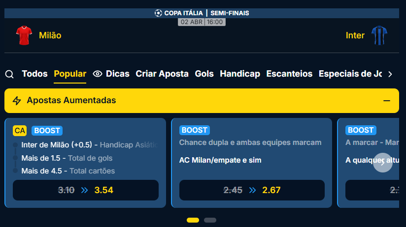 Aproveite as vantagens das Apostas Aumentadas no EstrelaBet para apostar ao máximo o Milão x Inter. Um duelo único merece o melhor lugar para desfrutá-lo: Registre-se no Estrelabet Brasil!