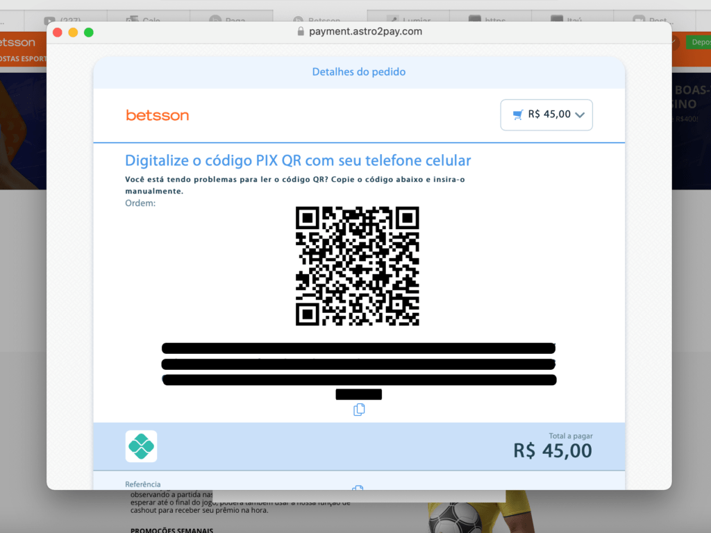 No momento, só é possível depositar e retirar dinheiro na Betsson do Brasil via PIX. Não há outros métodos de pagamento para transações.