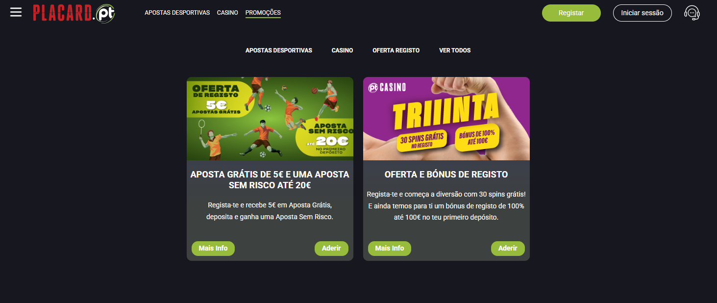 Os bónus são benefícios adicionais fornecidos pela Casa que ajudarão os utilizadores a tirar o máximo partido dos seus talentos nas Apostas Desportivas. Como dissemos na introdução, terá também acesso a um excelente Casino Online dentro do Placard, pelo que existem promoções e exclusivos para esta atividade.