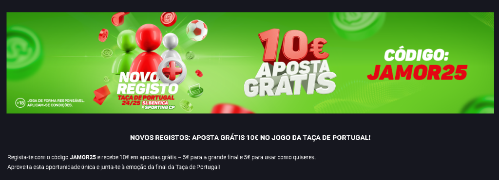 Lembre-se que existe um total de 5 euros em Apostas Grátis para aproveitar na Final da Taça de Portugal entre o Benfica e o Sporting. Os outros 5 euros, para o evento desportivo da sua escolha. E se quiser mais, consulte o Bónus de Apostas Desportivas Placard.