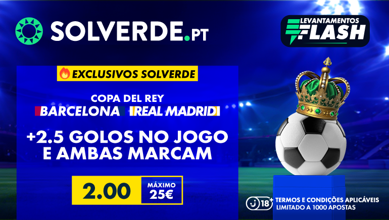 Esta oferta Solverde para aproveitar no Barcelona vs Real Madrid começa às 10:00 de sábado, 26 de abril, e vai até às 09:59 de domingo, 27 de abril. Entretanto, a final da Copa del Rey entre o Barcelona e o Real Madrid será disputada no sábado a partir das 22:00.
