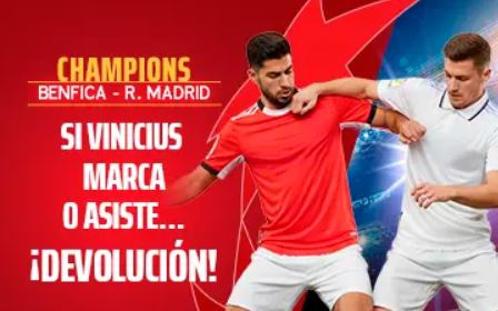 - Si fallas tu apuesta al Benfica – Real Madrid pero Vinicius marca o asiste… ¡Te devuelven la mitad hasta 10€!