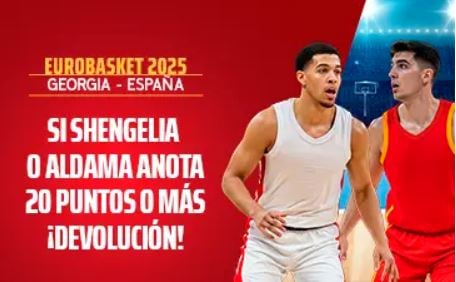 Sportium ha preparado una promoción especial para el partido Georgia vs España en el Eurobasket 2025. Si realizas una apuesta al encuentro y no aciertas, pero alguno de los jugadores estrellas —Shengelia o Aldama— logra anotar 20 puntos o más, recibirás automáticamente el 50% de tu apuesta en Freebet, con un máximo de 10€. Una manera de disfrutar el partido con mayor seguridad y menos riesgo.