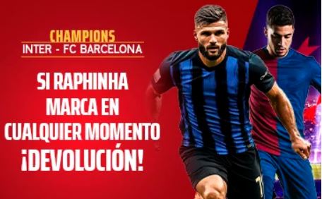 Sportium lanza una promoción especial para el duelo de la UEFA Champions League entre Inter vs Barcelona. Si haces tu apuesta prepartido y fallas, pero marca Raphinha, recibirás el 50% de tu apuesta como Freebet, hasta un máximo de 10€. Solo necesitas registrarte o iniciar sesión, activar la oferta y apostar a una cuota mínima de 1.50 en mercados seleccionados.