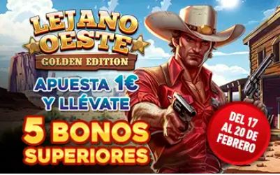 Sportium ha preparado una oferta especial para los amantes de las tragaperras. Apuesta al menos 1€ en dinero real en Lejano Oeste Golden Edition y obtén 5 bonos superiores. Disfruta de una experiencia de juego única con gráficos inmersivos, funciones avanzadas y una temática repleta de acción.