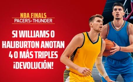 La casa de apuestas Sportium ha lanzado una promoción para el Pacers vs Thunder de NBA Finals. Apuesta y si fallas pero Willliams o Haliburton anotan 4 o más triples, te devuelven la mitad de lo apostado hasta 10€.
