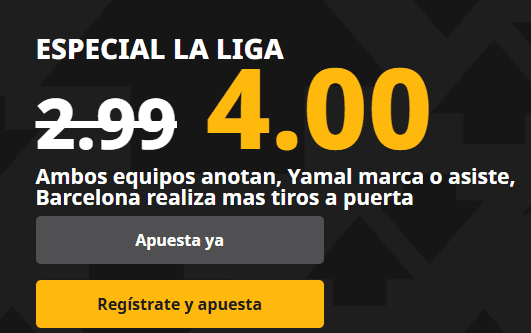 La apuesta mejorada de Betfair es el pronóstico combinado «Ambos equipos anotan gol, Yamal marca o asiste y Barcelona realiza más tiros a puerta»: cuota 2.99 -> supercuota 4.00. Está disponible tanto para nuevos clientes que se registren desde nuestros enlaces como para usuarios que ya tengan su cuenta creada. ¡Te contamos todas las claves!