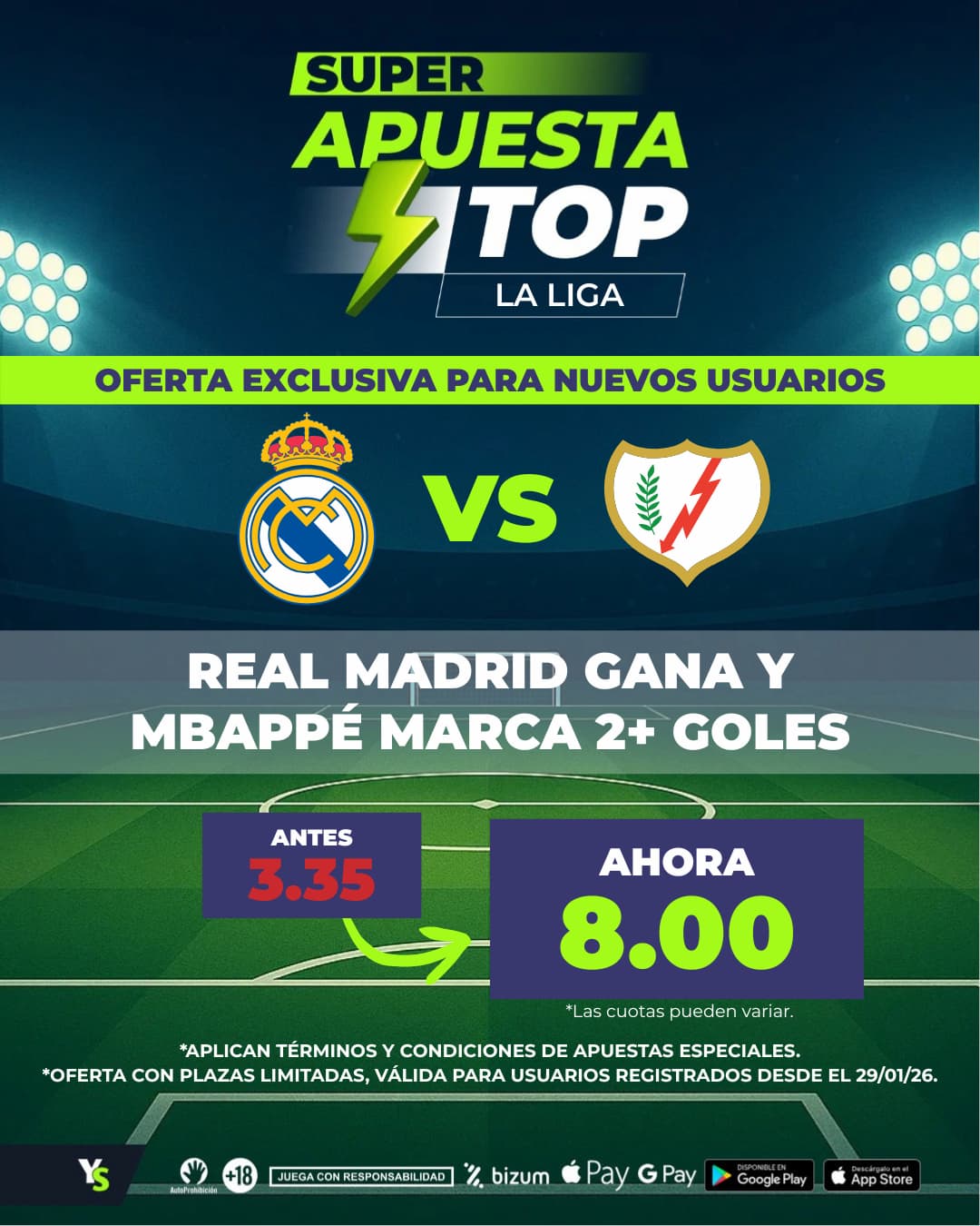 Aprovechar la Supercuota YoSports del Real Madrid vs Rayo Vallecano junto con su bono de bienvenida de hasta 150€ es una excelente forma de empezar a apostar con mayor margen y mejores condiciones. Una combinación pensada para sacar el máximo partido a uno de los partidos más esperados de la jornada.