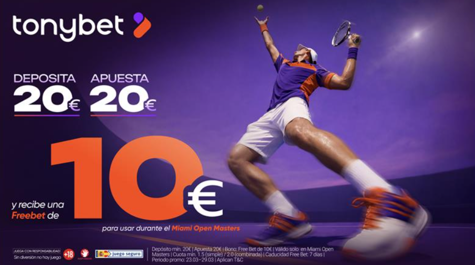 La casa de apuestas de TonyBet ha publicado una nueva promoción con la que los apostantes a tenis podrás conseguir 10€ en freebets apostando al ATP Masters 1000 de Miami.