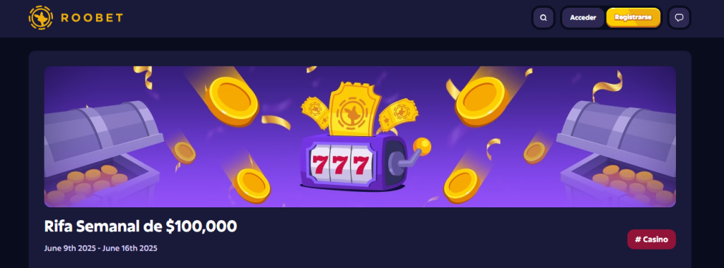 En esta oportunidad, debemos mencionar que el beneficio destacado para el casino es la Rifa Semanal de $100.000. Esta promoción te permitirá obtener boletos por cada $250 apostados en cualquier juego del casino. Además, si apuestas en el Juego Destacado de la Semana, ¡los boletos que acumules valdrán el doble! Esta es una forma ideal de sumar chances de ganar mientras disfrutas de los títulos más populares del sitio. Este beneficio es sumamente exclusivo de Roobet.