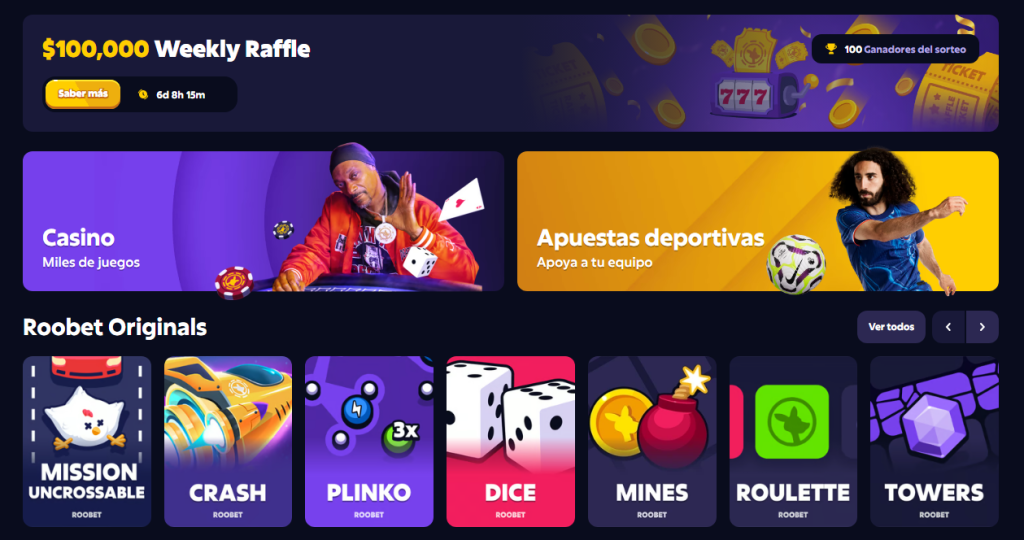 Máquinas Tragamonedas, Casino en Vivo con croupiers reales, Juegos de inversión, originales de Roobet y muchísimas otras categorías le dan vida, color y alegría a la plataforma. ¡La diversión se extiende hasta el infinito y, junto a ella, las recompensas de dinero en efectivo!