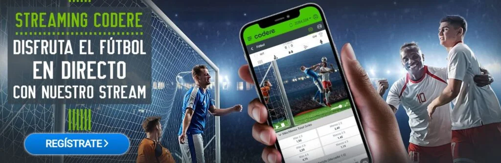 Recuerda que el Streaming de Codere tiene dos características muy interesantes. La primera es que puedes ver los partidos aumentando pantalla para no perder detalle y la segunda es que, mientras ves la retransmisión, puedes realizar tus apuestas y navegar por la web. Y, por supuesto, podrás hacer uso del streaming desde la app de Codere para Android e iOS.