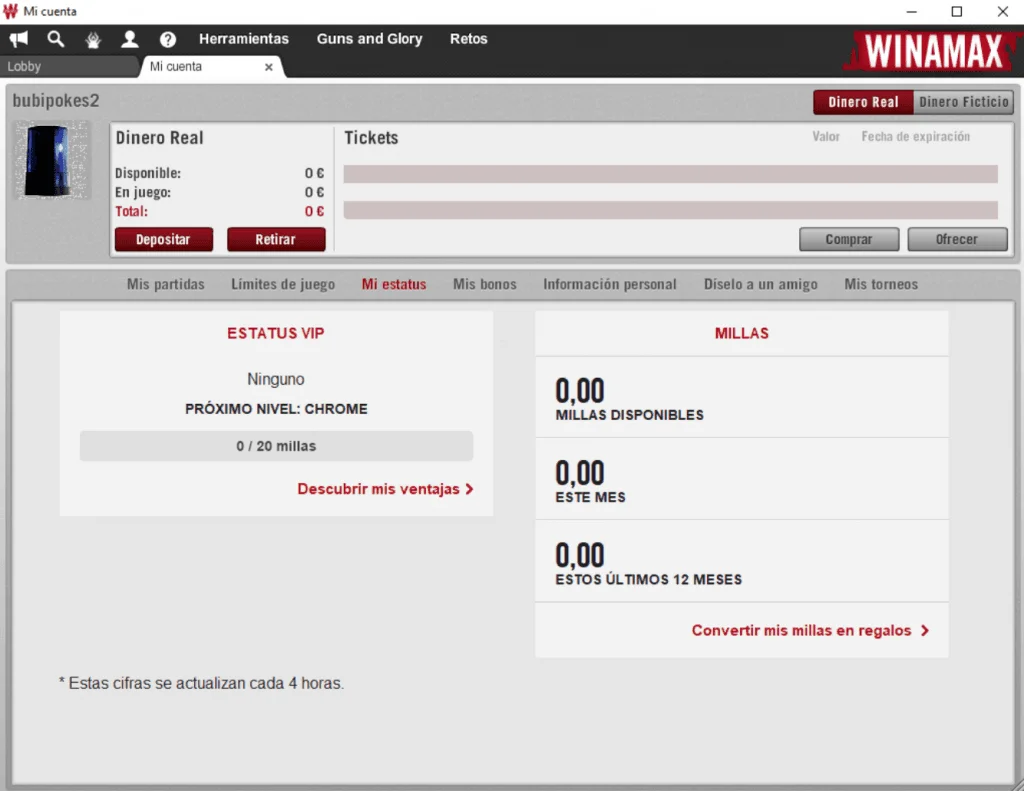 Podemos acceder a Mi cuenta (4) donde encontrarás cualquier información relacionada con tu cuenta en Winamax. Datos personales, contraseañas, status VIP, partidas en curso y mucho más. También podrás establecer tus límites de juego para delimitar el rango de partidas que puedes jugar.