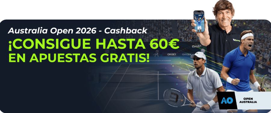 Gracias a esta oferta, los usuarios pueden obtener hasta 60€ en cashback, aprovechando tanto apuestas prepartido como en directo, en encuentros del Australian Open. Una oportunidad ideal para cubrir partidos largos, favoritos claros o incluso sorpresas de las primeras rondas.